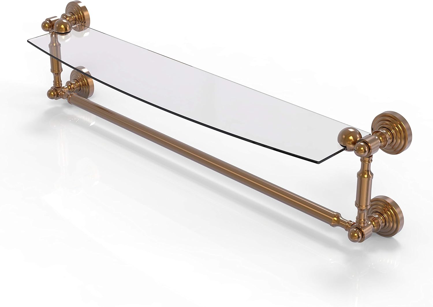 Add space and organization to your bathroom with this simple, contemporary style glass shelf. Featuring tempered, beveled-edged glass and solid brass hardware this shelf is crafted for durability, strength and style. Integrated towel bar provides space for your favorite decorative towels or for your everyday use. One of the many coordinating accessories in the Allied Brass Collection of products, this subtle glass shelf is the perfect complement to your bathroom decor.